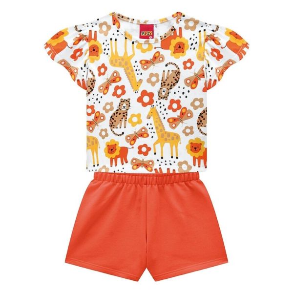 Conjunto Kyly com blusa em malha e short em moletinho leve. A estampa vibrante e divertida garante estilo e conforto para a rotina da criança.