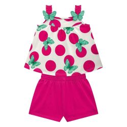 Conjunto Kyly com bata em malha leve e short em moletinho sem felpa. Com estampa divertida de bolinhas e borboletas aplicadas nas alças, é ideal para os dias de sol com muito estilo e conforto.