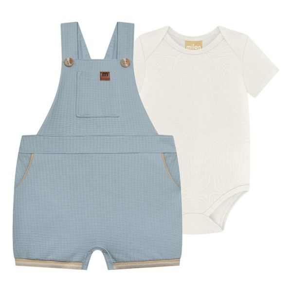 Conjunto Milon composto por body em cotton macio e jardineira em malha favo com textura delicada. Ideal para compor looks confortáveis e estilosos para o bebê.