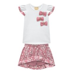 Tipo de tecido: malha cotton com elastano, de toque suave e elástico Acabamento: aplicação de laços bordados e detalhe contrastante nas mangas Modelagem: blusa levemente ajustada e shorts-saia com cós elástico Estilo: casual romântico