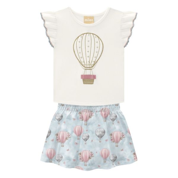Conjunto Milon encantador e delicado, composto por blusa em cotton macio com bordado de balão e aplicação de tecido, e saia em chiffon leve e fluido com estampa suave. Os detalhes de babadinhos nas mangas e medalhinha metálica trazem um toque de charme e elegância. Ideal para momentos especiais com conforto e estilo.