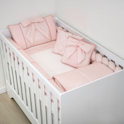 Tecido: suedine e meia malha com toque macio Acabamento: bordado protegido com aplique e estampa rotativa exclusiva Hug Tecnologia: nanotecnologia com ação antibacteriana, antifúngica e anti pilling Fechamento/fixação: amarrações e ajustes conforme cada peça Estilo: romântico, com laços e tons suaves Faixa etária recomendada: desde recém-nascido até 1 ano, para berço padrão nacional Dimensões do produto  (em cm) Cabeceira: 52 × 34 Sobre lençol: 98 × 170 Fronha: 40 × 30 Edredom: 98 × 150 Lençol com elástico: 70 × 130 × 14 Trança lateral: 210 × 12 Rolo lateral: 130 × 12 2 Almofadas (aproximadamente 30 × 30 cm cada)
