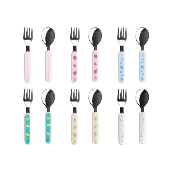Kit com garfo e colher em inox, segurança para os pequenos com pontas arredondadas e cabos divertidos. Ideal para incentivar a autonomia na hora das refeições com estilo e higiene.
