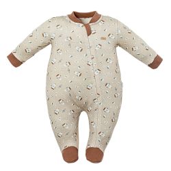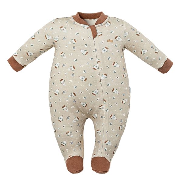 Macacão Hug em suedine com estampa delicada, manga longa e fechamento frontal, ideal para conforto e liberdade de movimento nos bebês.