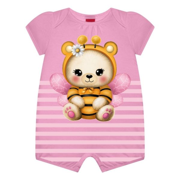 Tipo de tecido: malha penteada leve e respirável Acabamento: estampa frontal com efeito de brilho e detalhe colorido Modelagem: confortável, com mangas curtas e entrepernas com botões de pressão para facilitar a troca Estilo: casual e divertido