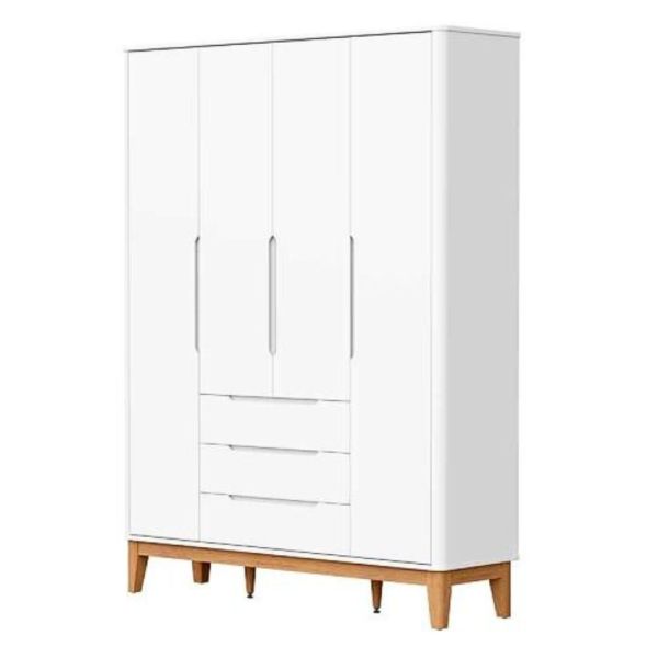 O Roupeiro Boom 4 portas da Reller combina funcionalidade, segurança e um design contemporâneo. Possui cabideiros metálicos, corrediças telescópicas, dobradiças com sistema slow motion e pés em madeira Pinus. Ideal para manter o quarto do bebê sempre organizado com charme e durabilidade.