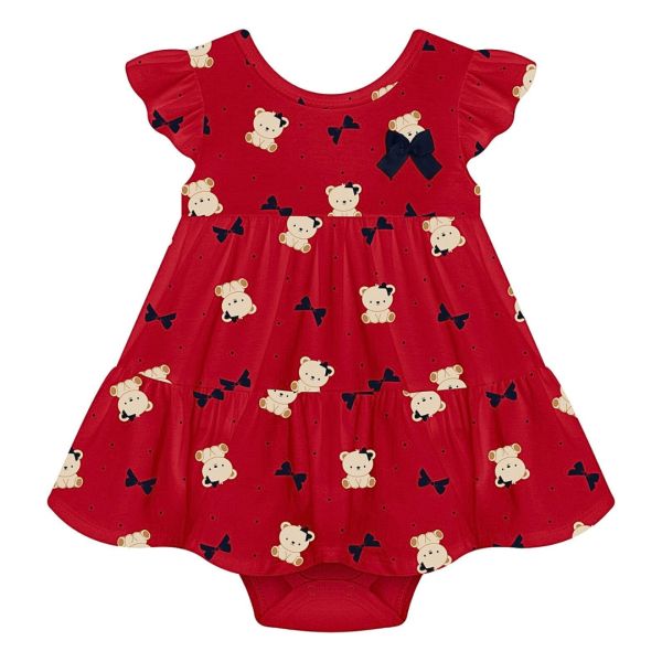Vestido Kyly em malha confortável com estampa de ursinhos e aplicação de laço. Possui mangas com acabamento delicado e modelagem soltinha, garantindo charme e liberdade para o bebê.