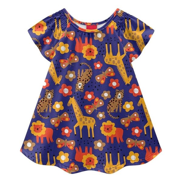 Vestido Kyly em malha com estampa rotativa de bichinhos da selva. Modelagem soltinha e confortável para os dias mais divertidos da criança.