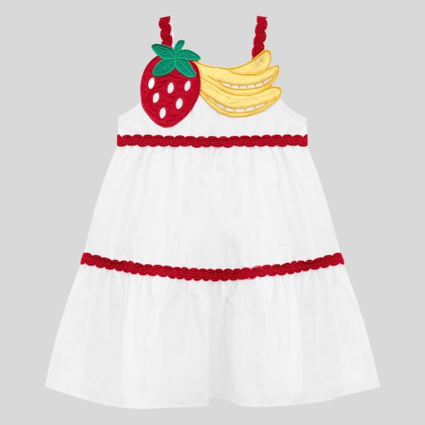 Vestido infantil em tom branco com aplicação de frutas (morango e banana) no busto e acabamentos em vermelho, trazendo alegria e estilo ao look.