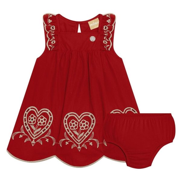 Vestido bebê Milon vermelho com detalhes bordados em bege e calcinha combinando. Modelo charmoso e confortável, perfeito para ocasiões especiais.